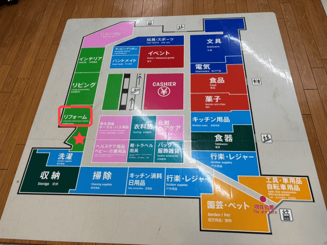防災グッズ棚はリフォームコーナー内★印にあります。