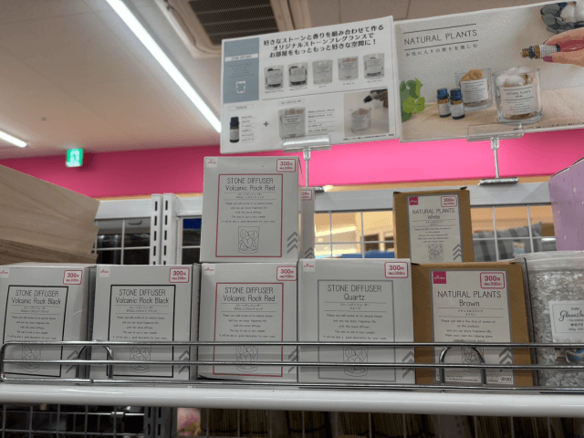店舗によって売り場配置が異なることもあるため、見つからない場合はインテリアコーナーのアロマグッズ棚を探してみてください。