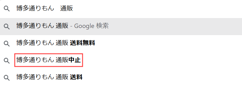 SNSだけではなく、博多通りもんと調べると「博多通りもん 通販中止」という検索キーワードが出てきます。