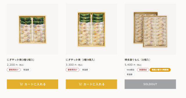 オンラインショップではにぎやっか衆、という「博多通りもん」を始め「博多玉露まんじゅう」、「博多じまん」の3種類の商品の詰め合わせのみ購入可能です。