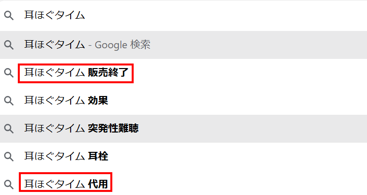 Google検索でも「耳ほぐタイム」と入力すると「販売終了」や「代用」というキーワードが出てくるためよく検索されていることがわかります。