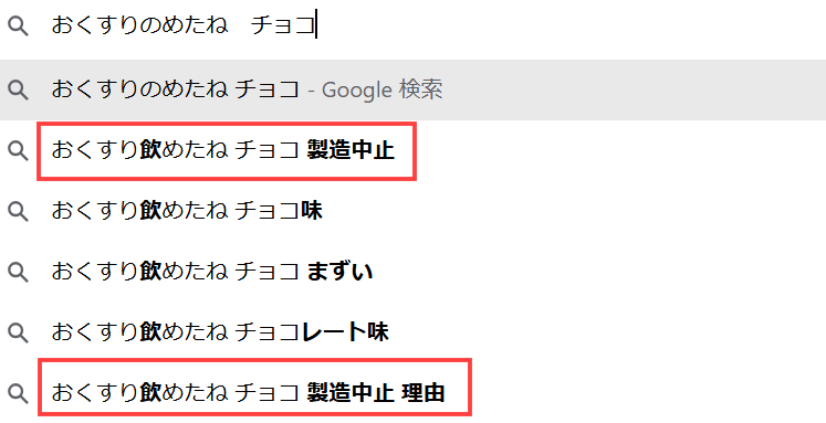 SNSだけではなく、おくすり飲めたねと調べると「おくすりのめたね チョコ味 製造終了」という検索キーワードが出てきます。